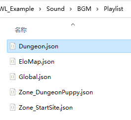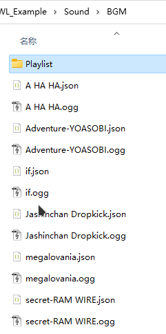 あなたのプレイリストファイルは Sound/BGM/Playlist サブフォルダーに配置されます。これらはシンプルなJSONファイルの形式です。