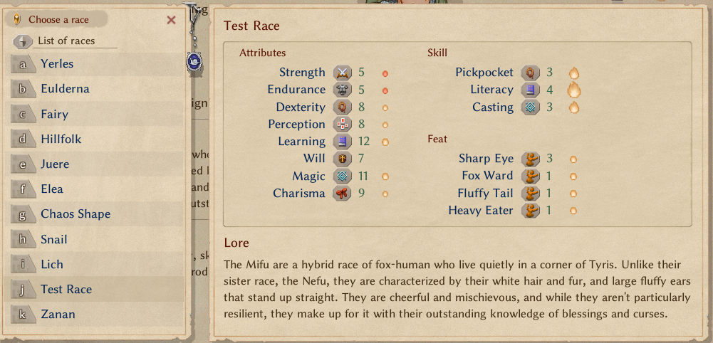 }You can go and make a new game to display the race overview during character creation. As you can see, the rename, Element addition, and playable flag changes were applied.